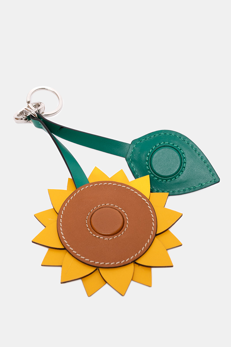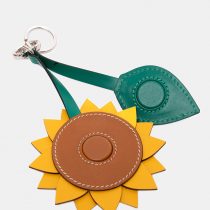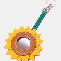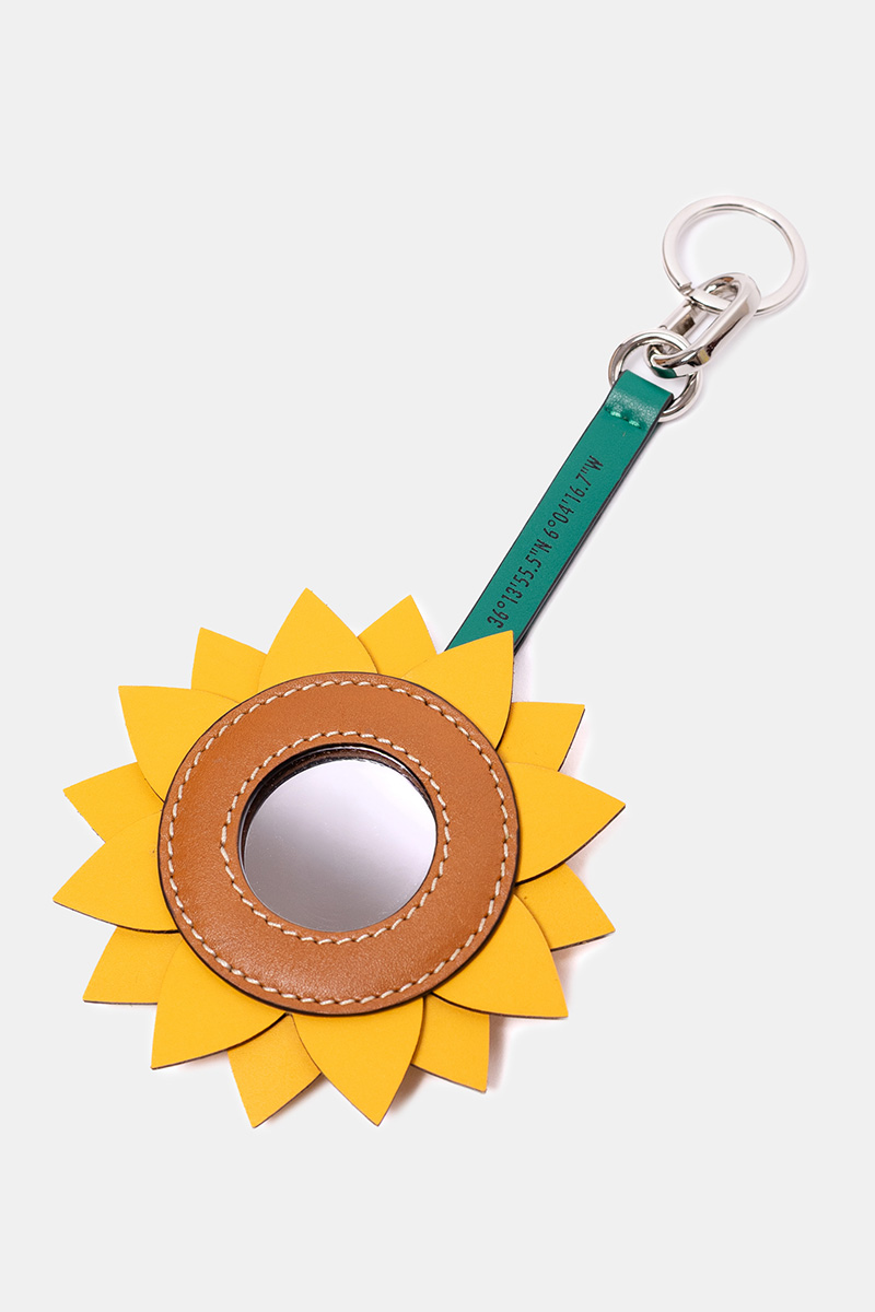 Pieza multifunción —charm, llavero, espejo y pinza para sombrero— hecha a mano en piel reciclada de vacuno, reutilizada y trabajada desde una lógica de diseño sostenible y economía circular.